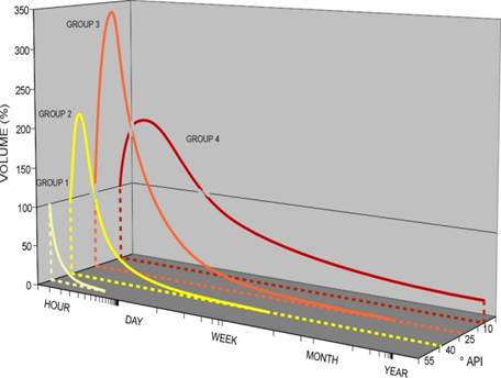 *Tasa de remoción de la superficie del mar de los hidrocarburos pertenecientes a los grupos I a IV, según sus propiedades físicas.